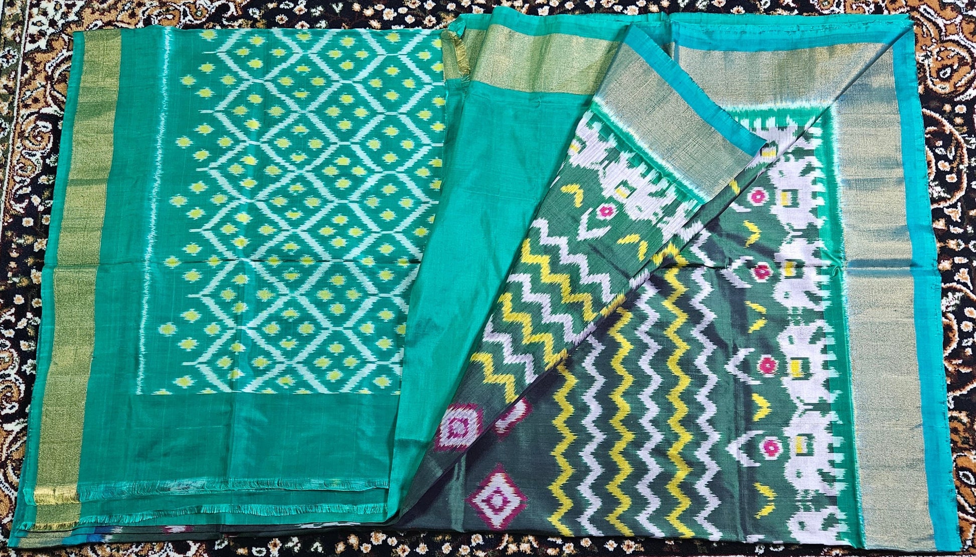 Immerse yourself in the exquisite artistry of this Pochampally Silk Saree, featuring a captivating elephant motif. Handwoven with meticulous precision, this saree showcases intricate ikat patterns and vibrant colors, reflecting the rich heritage of Telangana. The double ikat technique creates a unique and visually stunning effect, while the elephant motif adds a touch of charm and symbolism.